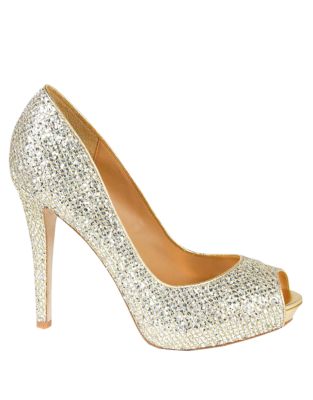 Make a statement and be a vision of grace and elegance with this heel from Badgley Mischka. This peep toe pump brings you gold sequins sewn into a delicate fabric upper. This stunning style is complete with a 4 1/2 inch heel and 3/4 inch platform.