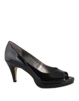 Mylah peep-toe pump features a faux patent leather upper, a comfortable footbed, smooth lining, 3 inch heel, 1/2 inch platform and a durable man-made outsole. Sizes 6M-10M. Click on Alternate View to see additional detail.